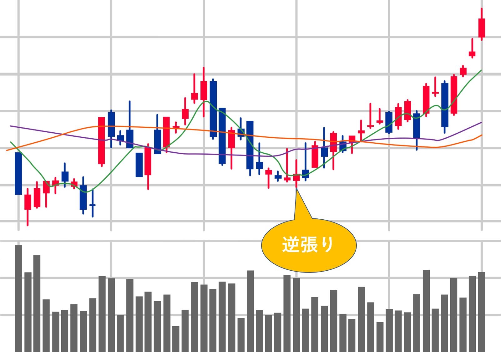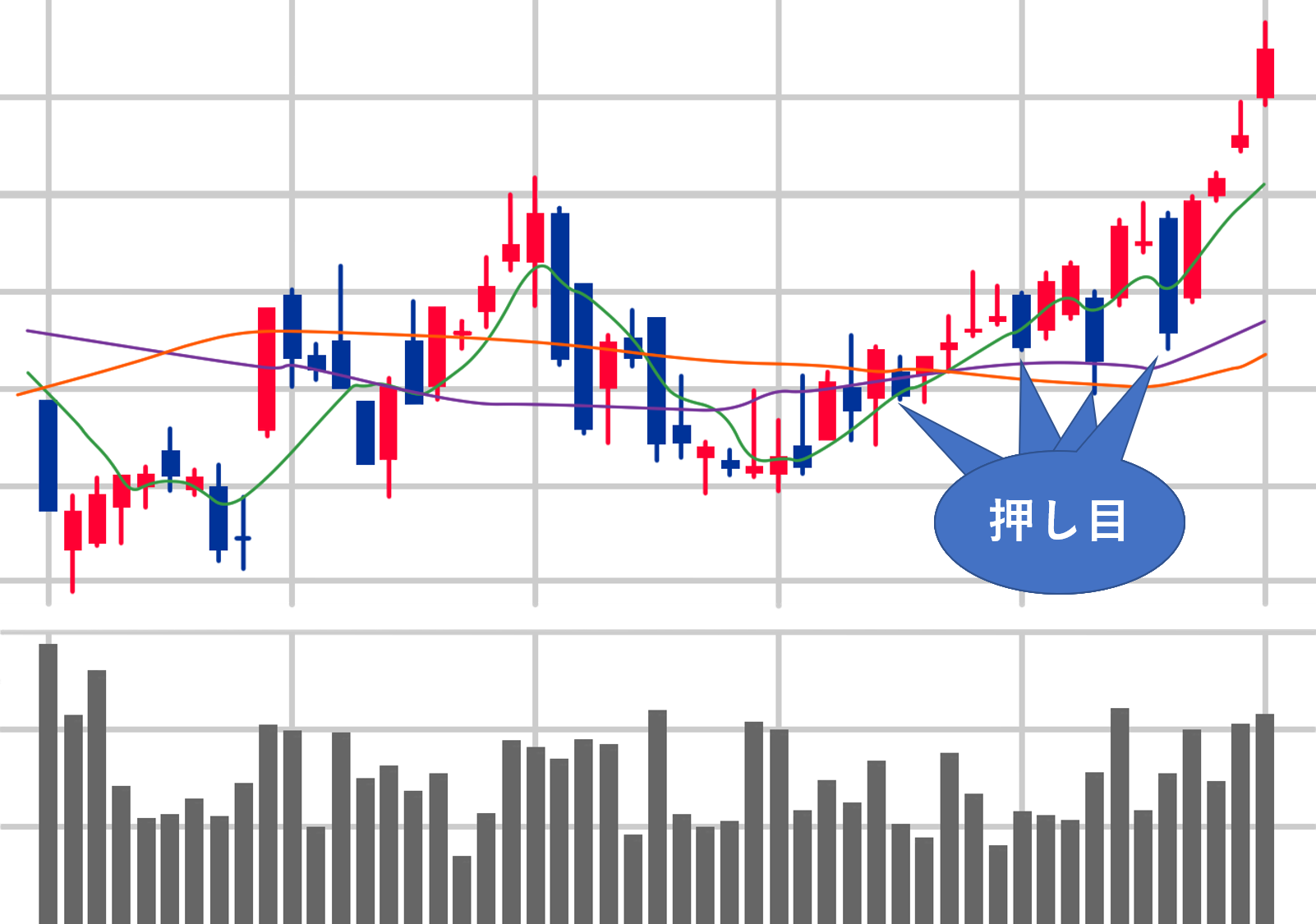 順張りは上昇トレンドに入ったもので、さらに株価が一時的に落ちた押し目を狙って入るのがオススメです。上昇トレンドに入った株は、みんな入りたいとは思っているけど、先ほどの高値掴みのリスクがあるため、少し下がったら買おうと考えています。そのため、少し下げた押し目に入ることで買いが集まりさらに上昇トレンドにうまく乗ることができます。