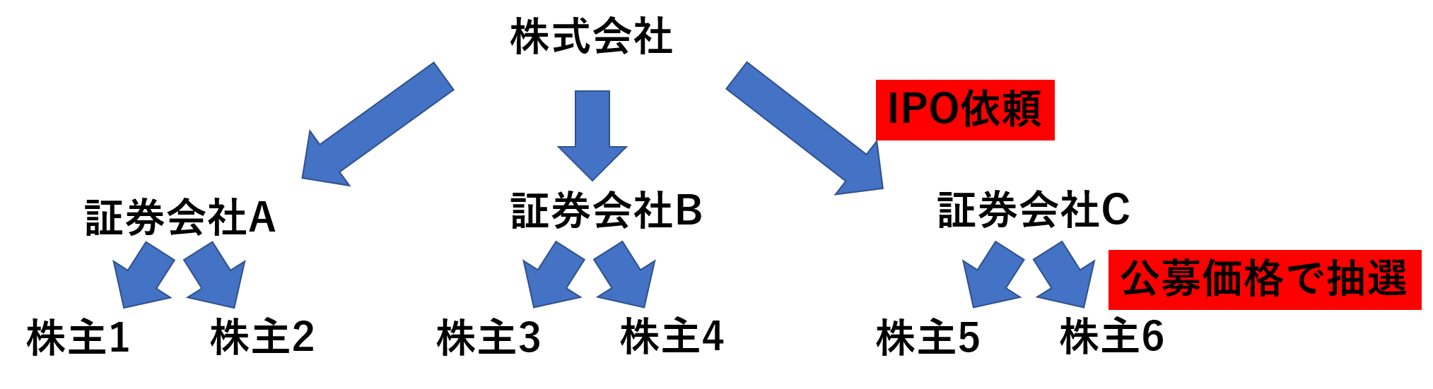 無事条件が問題なければ、会社は証券会社に上場をお願いします。この時、色々な証券会社に株が配られますが、メインとなる証券会社を主幹事証券と呼びます。主幹事証券は会社がIPOで調達した資本金の一部を手数料としてもらえるので、主幹事証券をやるメリットがあります。主幹事証券はIPO株を、公募価格と呼ばれる株価で配ります。