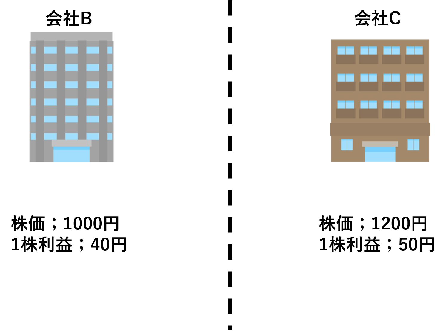 例えば、株価が1000円で1株利益が40円の会社Bと、株価1200円で1株利益が50円の会社Cがあったとします。