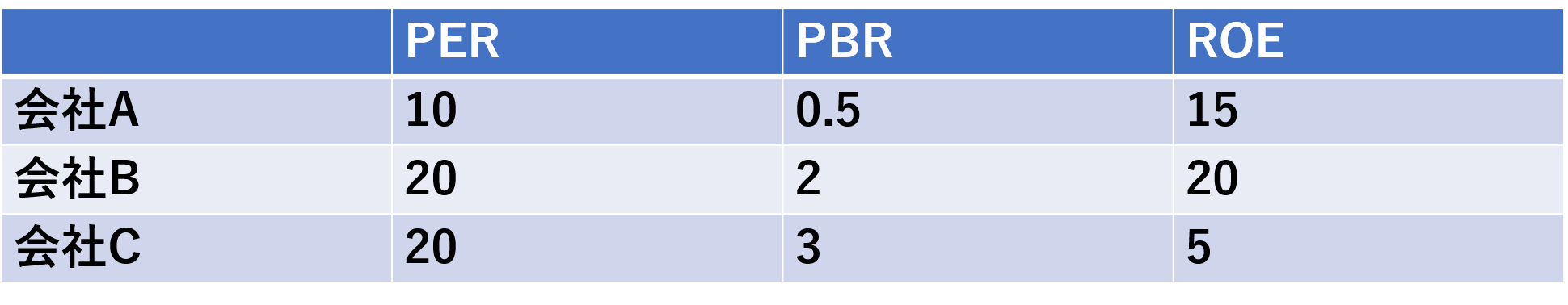PERが利益、PBRが資産、ROEが経営効率でしたね。次の3つの会社を見てみます。