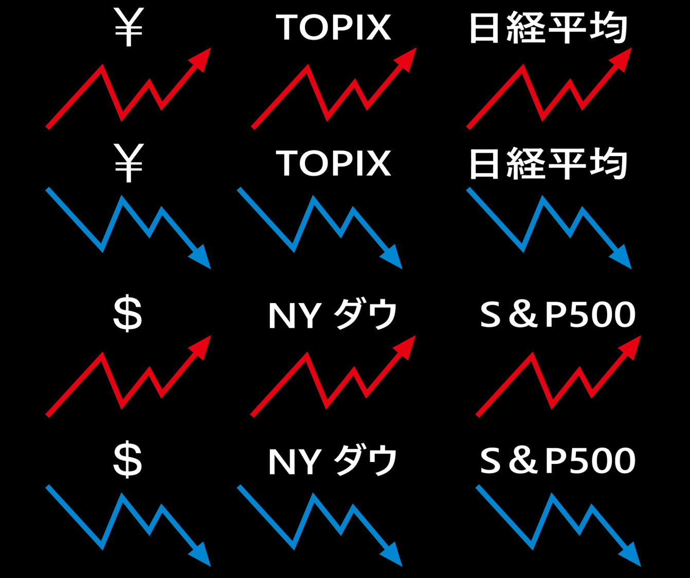 ダウ・ジョーンズ社が発表している30社の平均値のことをダウ平均と呼びます。内容が似ているだけでなく、基本的に日経平均はダウ平均と似た動きをします。そのため、ダウ平均が上がれば日経平均も上げることが多いですし、ダウ平均が下がれば日経平均も下げます。