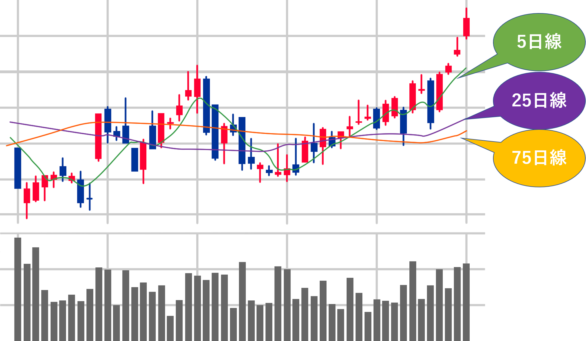 移動平均線は、一定期間の株価を平均化するので株価もそうですが、対象となる期間によっても変わってきます。5日線の他にも、25日線、75日線などがあります。移動平均線は、一般的に期間が長い方が線がなだらかとなります。