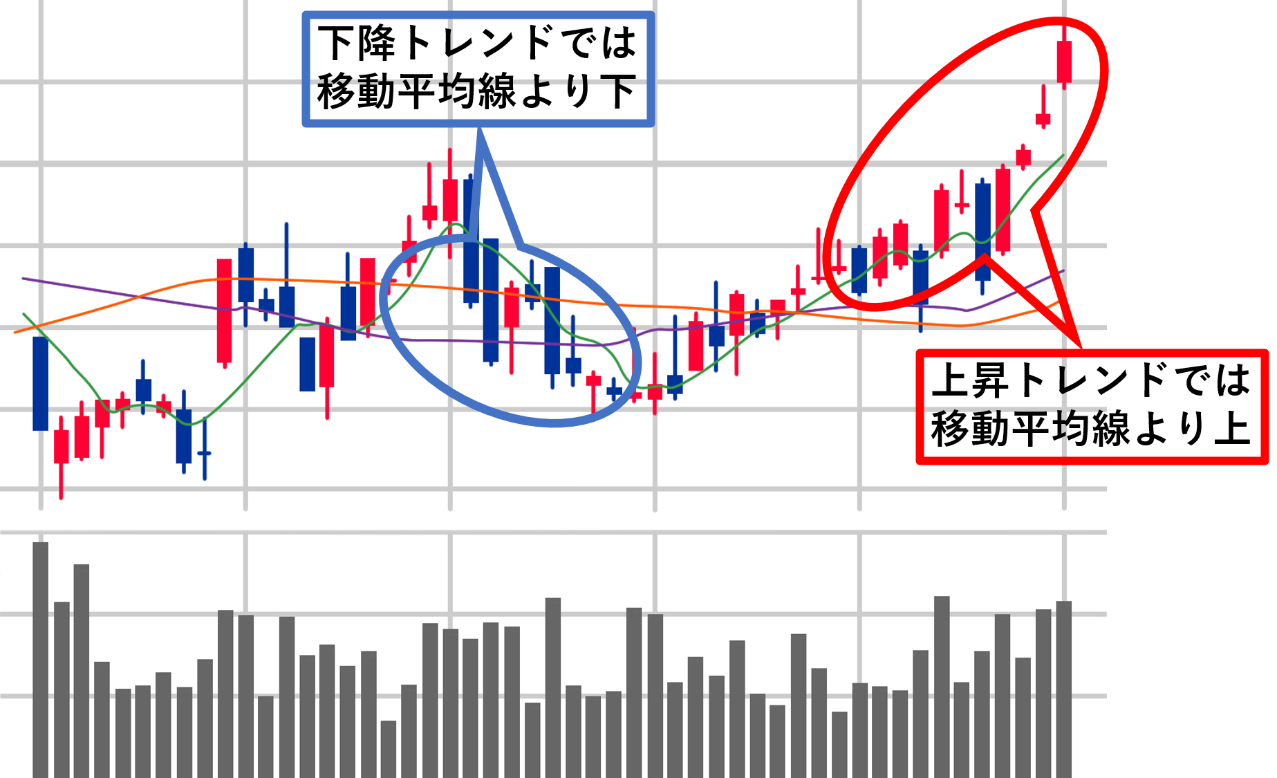 冒頭で移動平均線は大まかなトレンドをつかむのに役立つという話をしましたが、上昇トレンドにある時はローソク足が移動平均線より上にあることが多いです。逆に下降トレンドにある時はローソク足が移動平均線より下にあることが多いです。