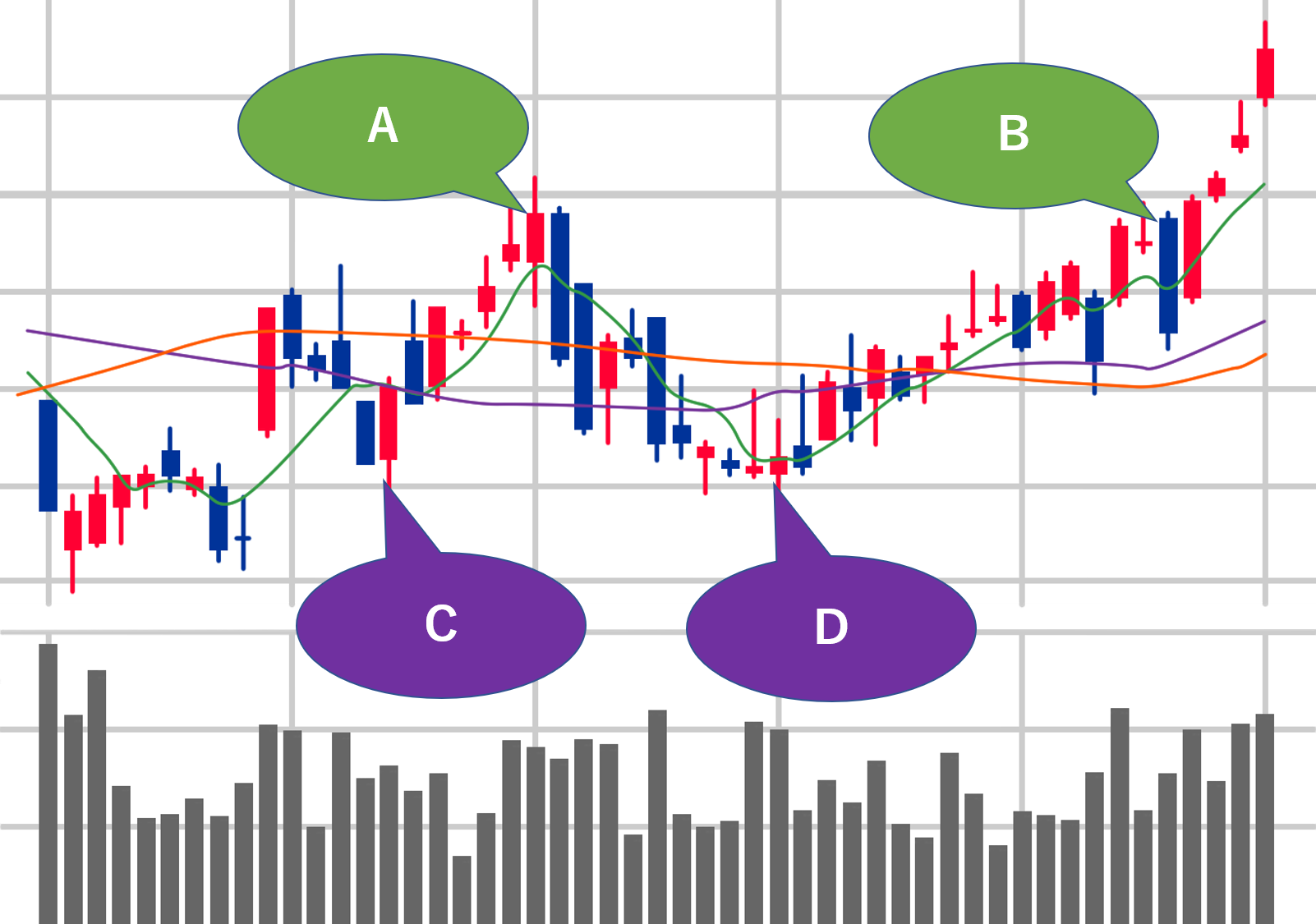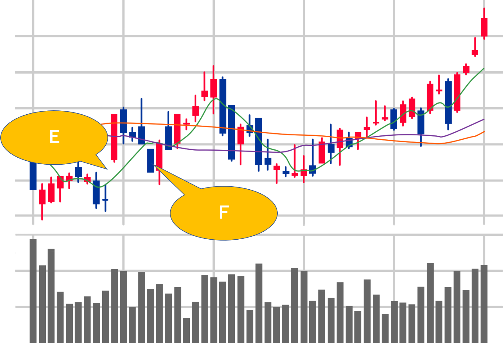 高値や安値と同様に、過去にもみ合った株価も「下に下がるかも」という警戒感からなかなか上がらずもみ合います。もみ合いを突破するには材料などが必要となることが多いです。さきほどのDではもみ合っていますが、買いが勝ち上昇トレンドへと転じています。