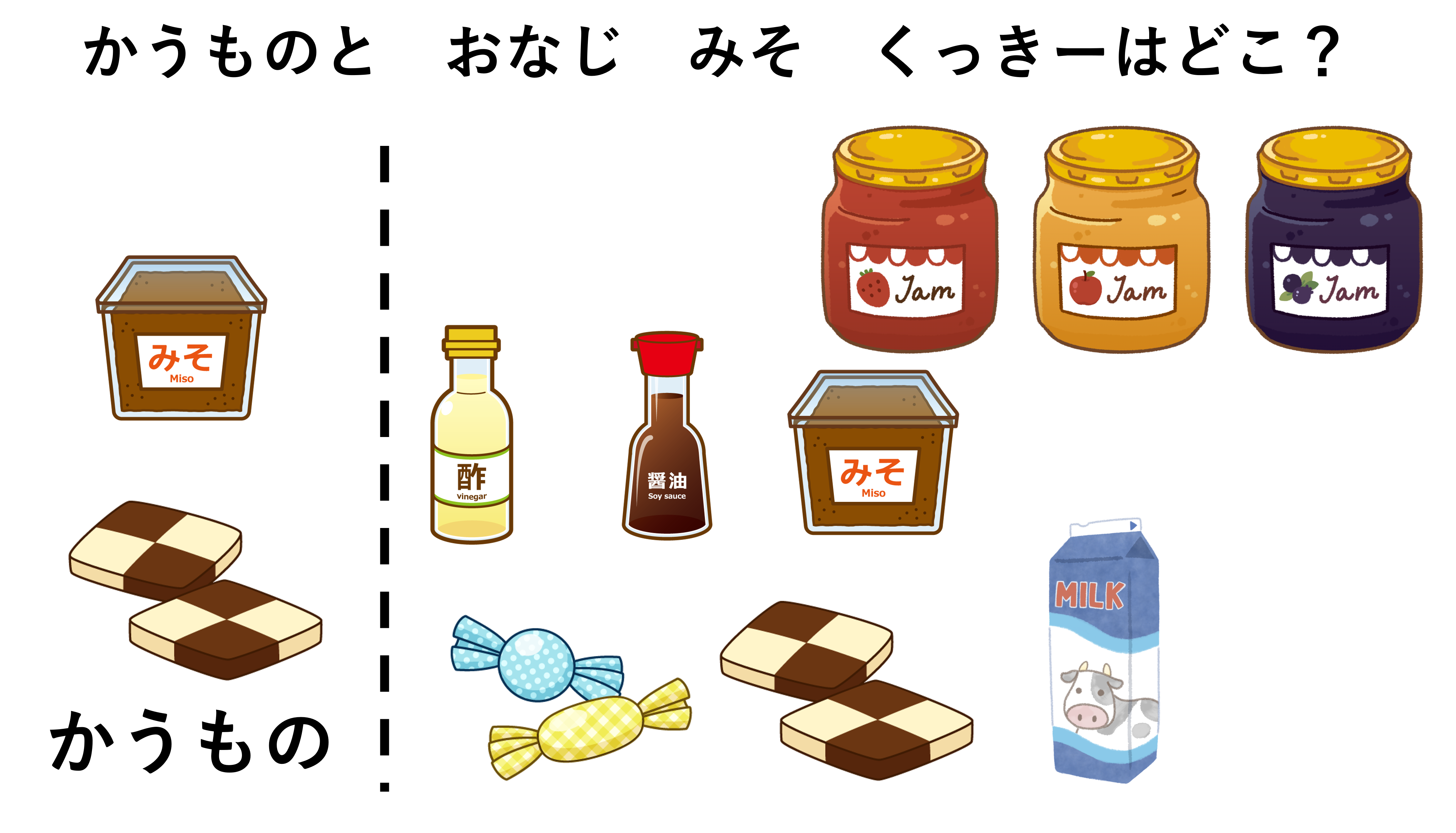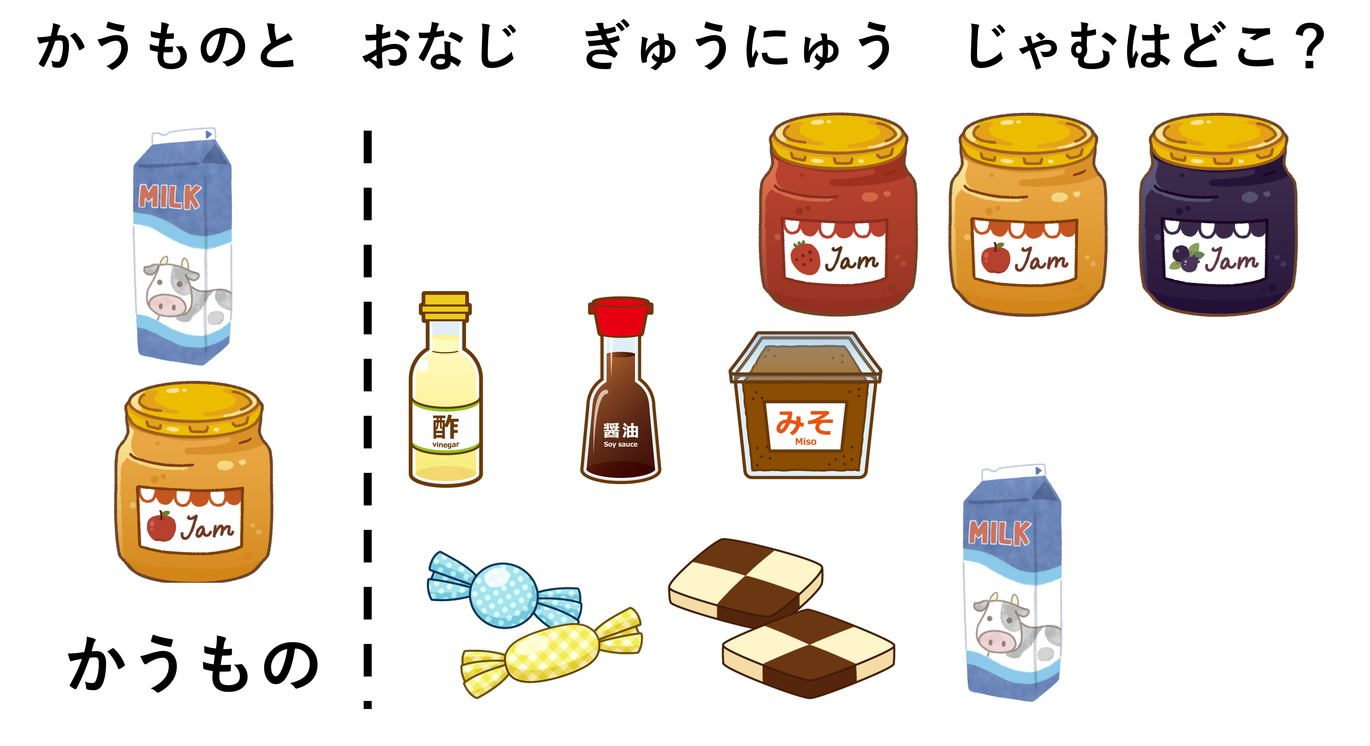 子供に、「お菓子を作るのに、材料の買い物のお手伝いをお願い。同じ牛乳とジャムを教えて」と伝えます。