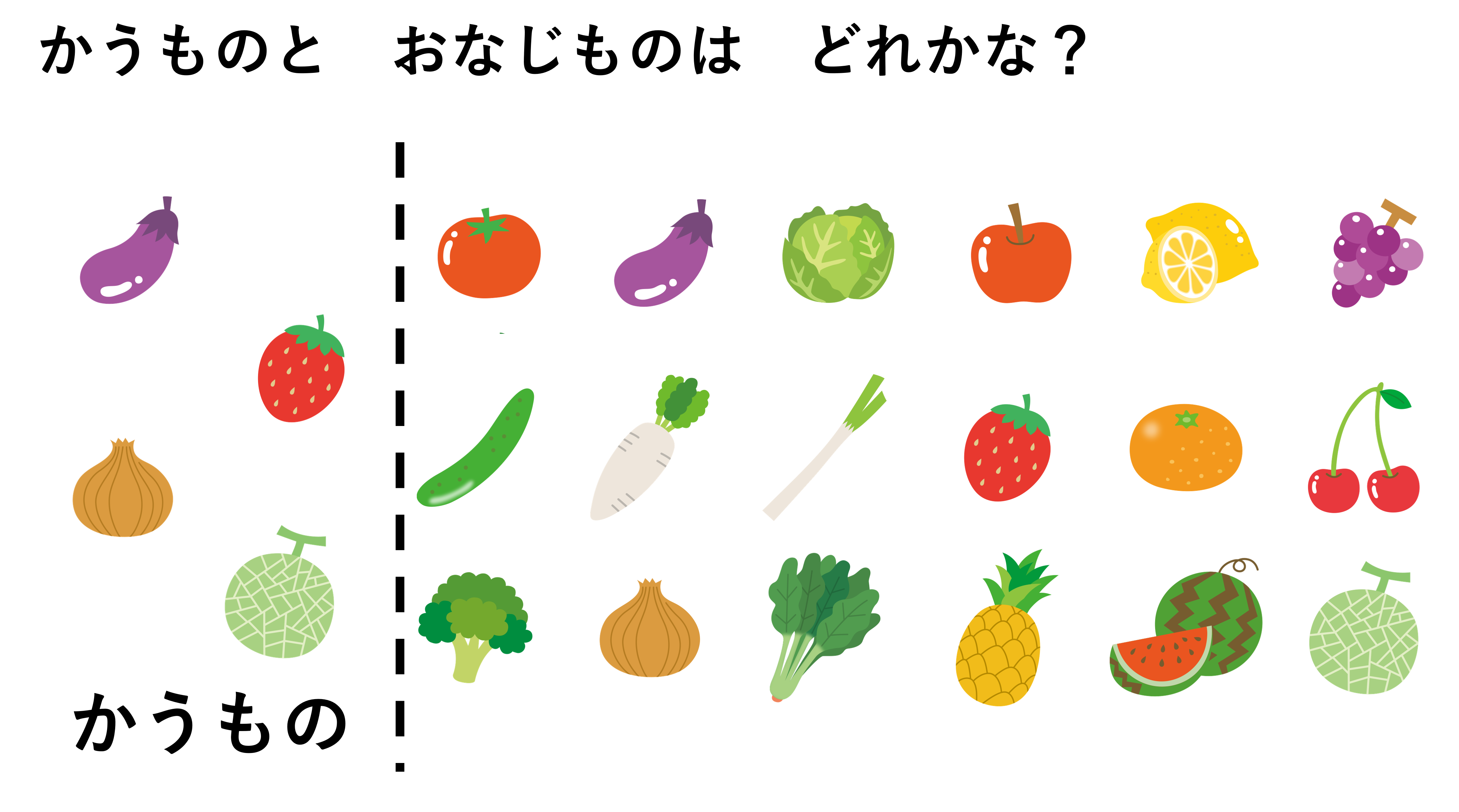 私たち親は当たり前のようにものを認識していますが、まだ子供は物の認知もうまくできません。物の認知を始めるうえで重要なのが特徴をとらえることです。特徴をとらえるために同じものを探す練習を行います。