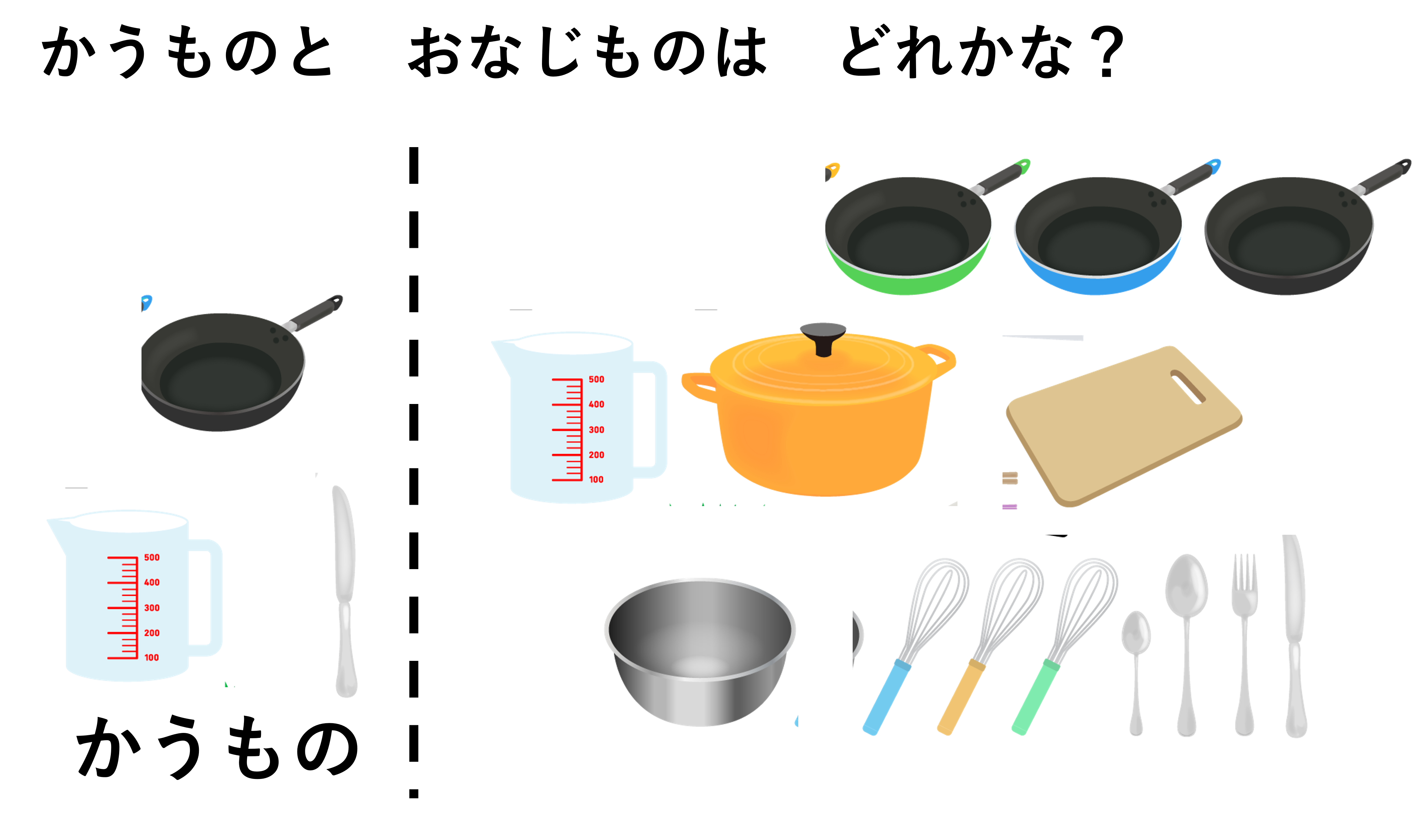 「次はお料理道具探すよー。どれかな?」と伝えます。違う色のフライパンがあるのでこちらも難易度高めです。