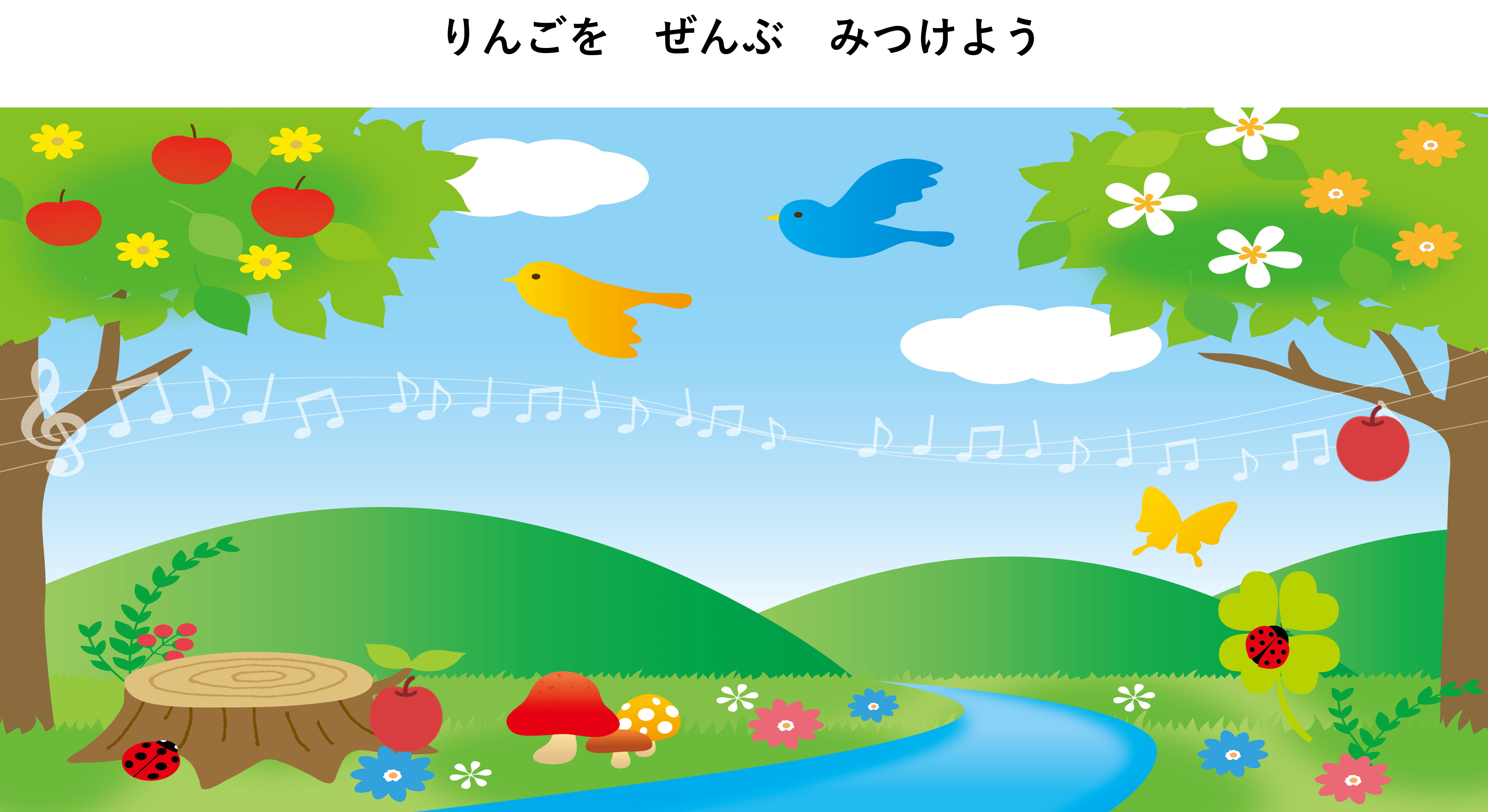 子供に「りんごを探しに行こう。りんごを全部見つけて教えて」と伝えます。てんとう虫にまどわされないようにしてください。