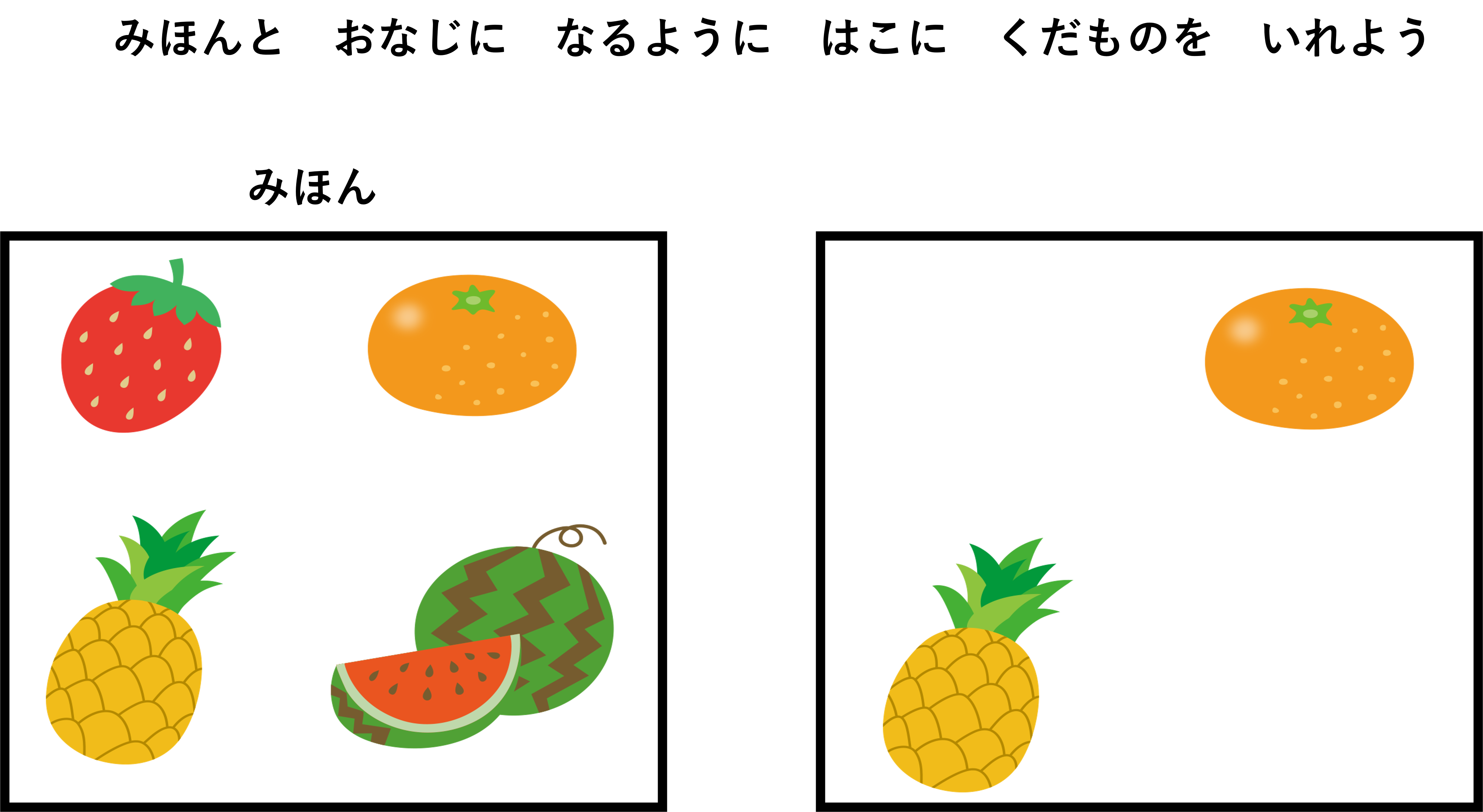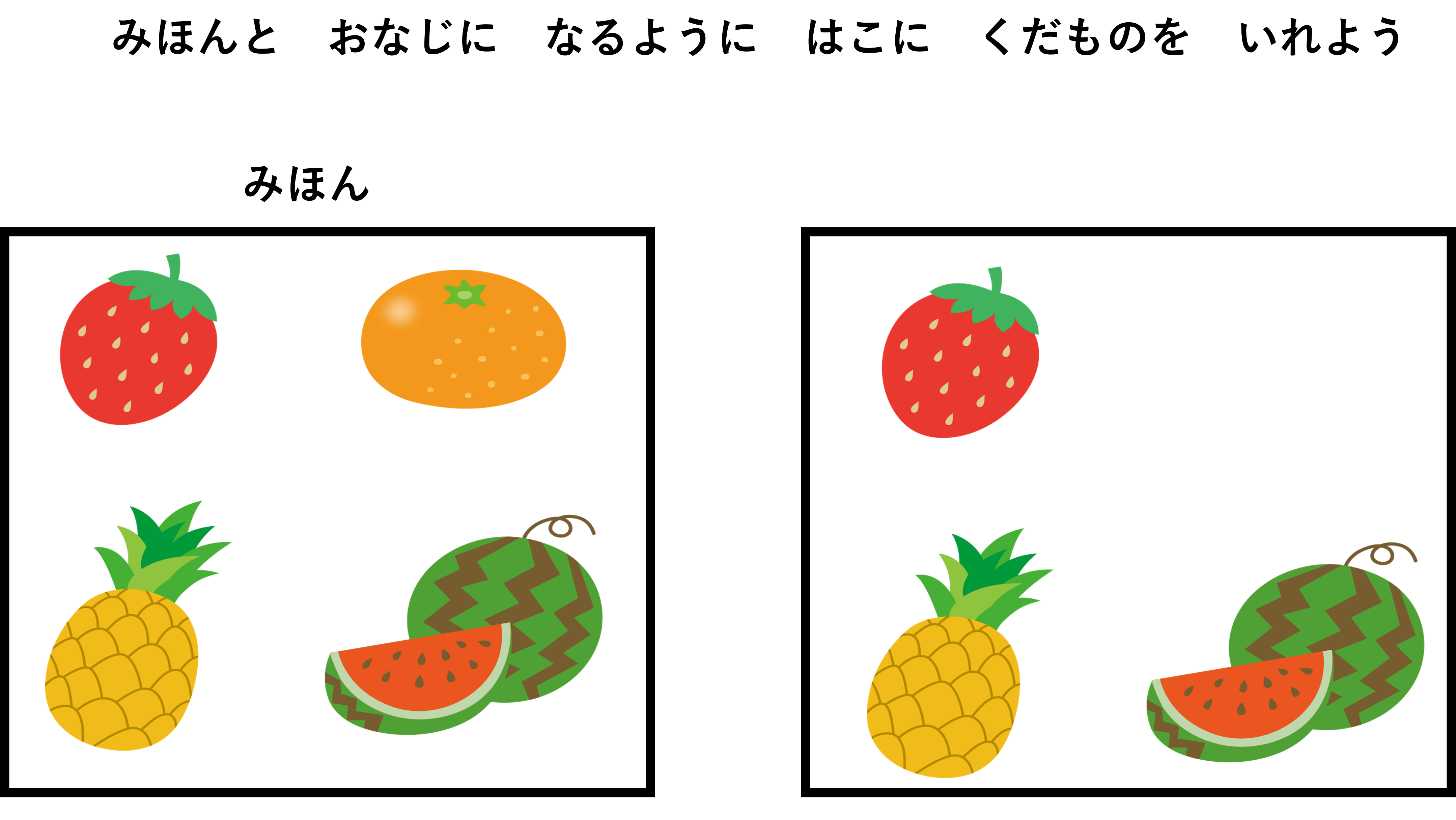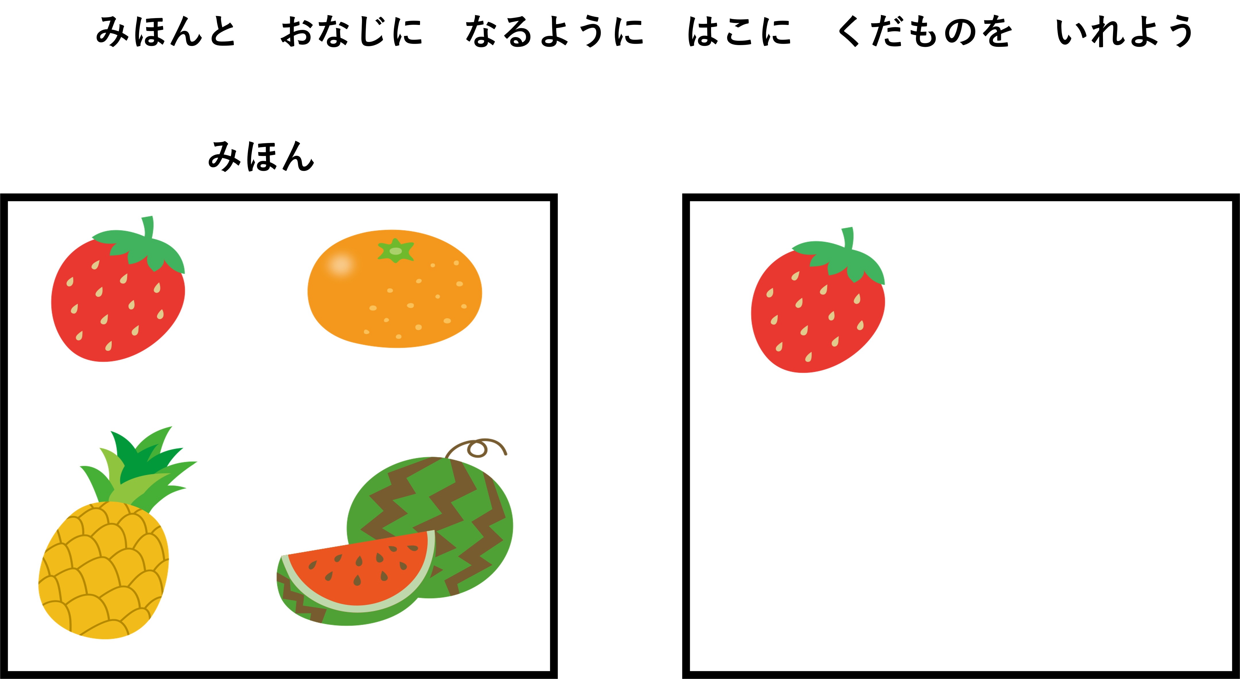 同様にもう1問。同じように「箱の中に見本とおなじように野菜や果物をつめて」と子供にやらせます。今度は2個です。