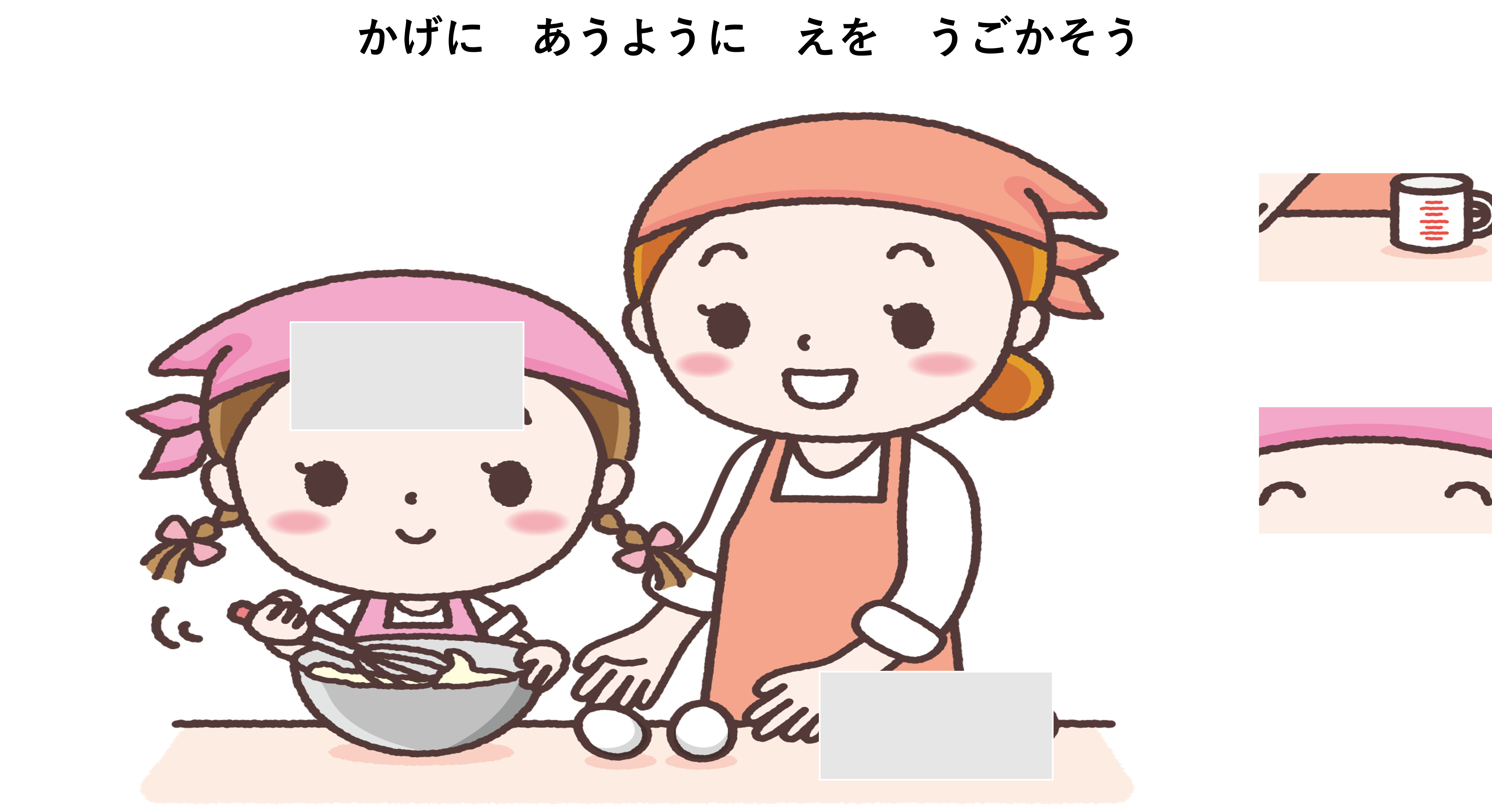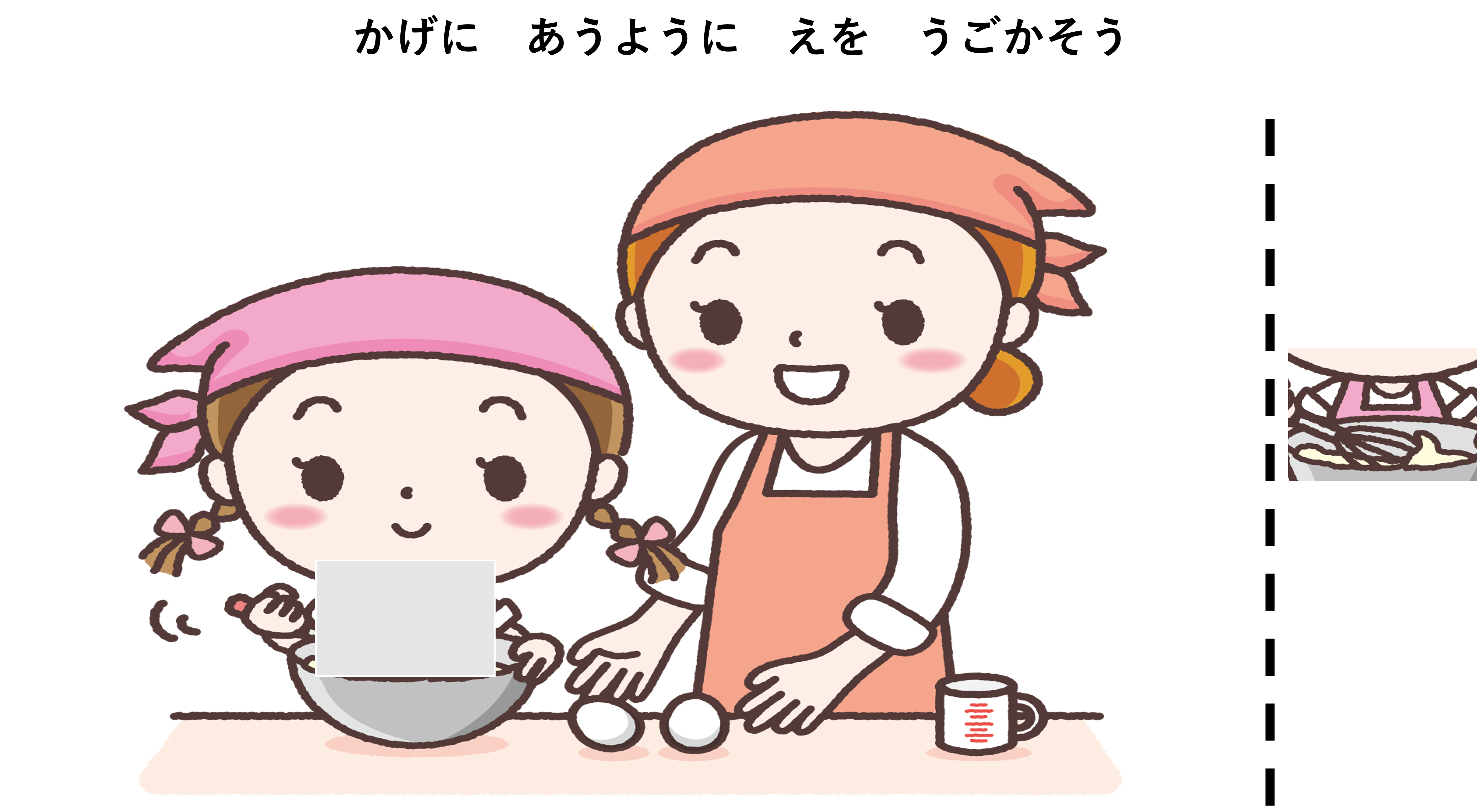 子供に「お菓子作りのお手伝いするよ。かげに合うように絵を動かそう」と伝えます。難しいようなら「影の周りの絵をよく見てみよう」とヒントを与えます。