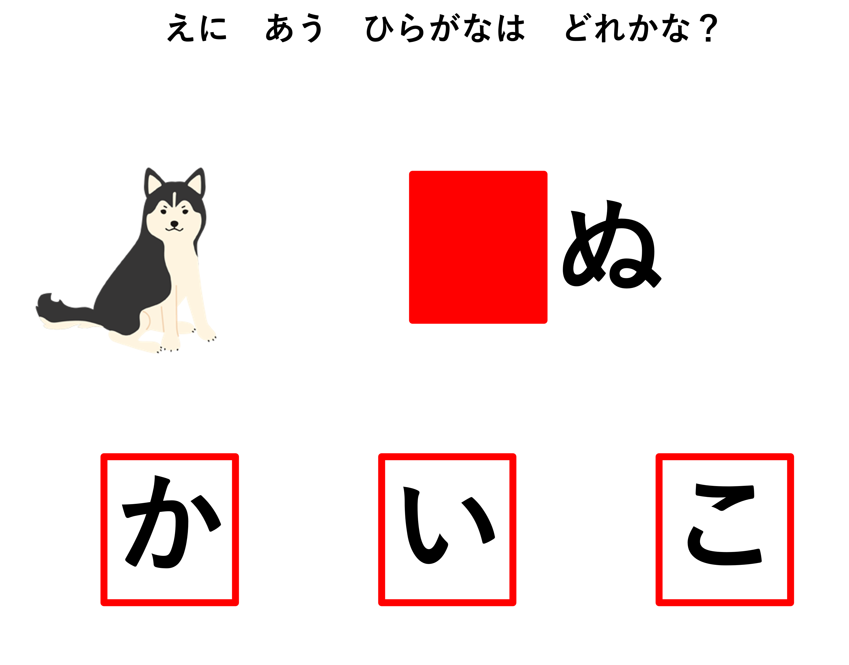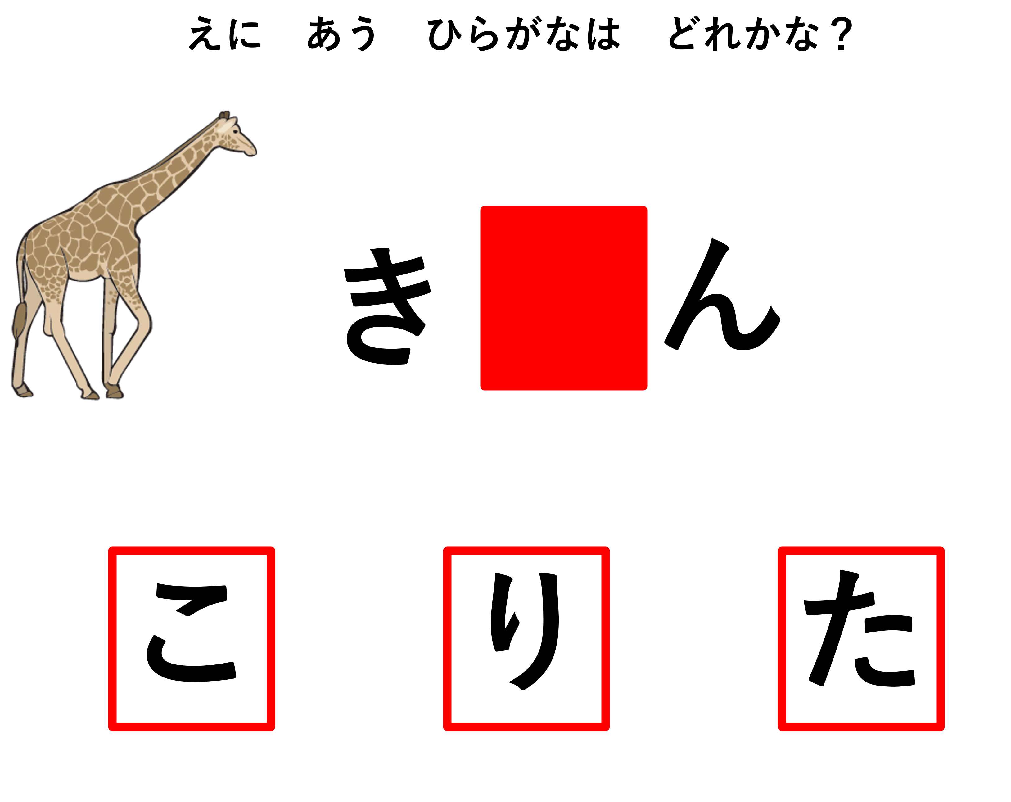 最後にもう1問。「次の動物の絵に合うひらがなはどれかな?」とつたえます。