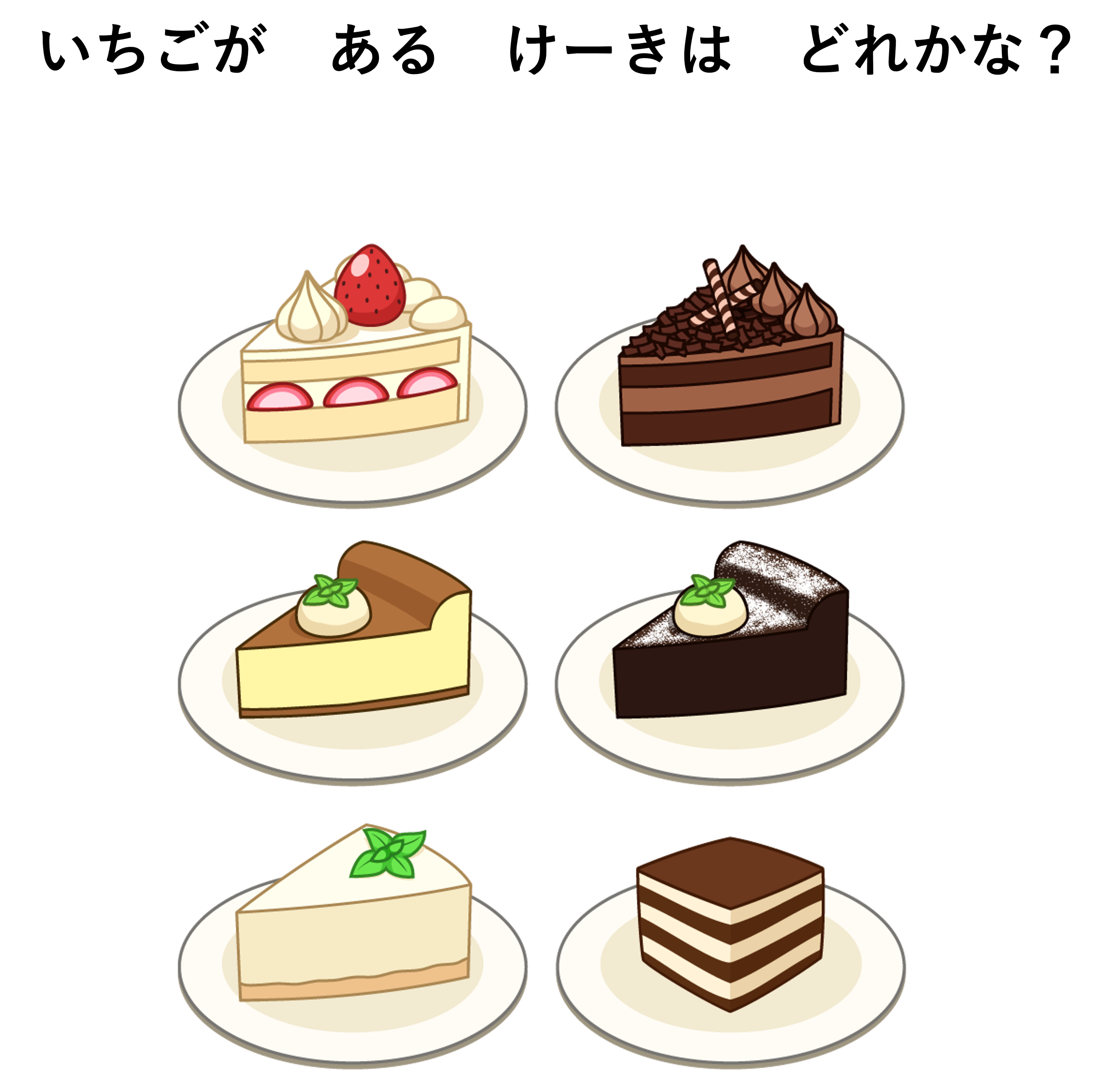 子供に「ケーキ屋さんのお手伝いするよ。いちごがあるケーキを探して」と伝えます。子供が悩んでいるようなら、「いちごはどこかな」と伝えます。