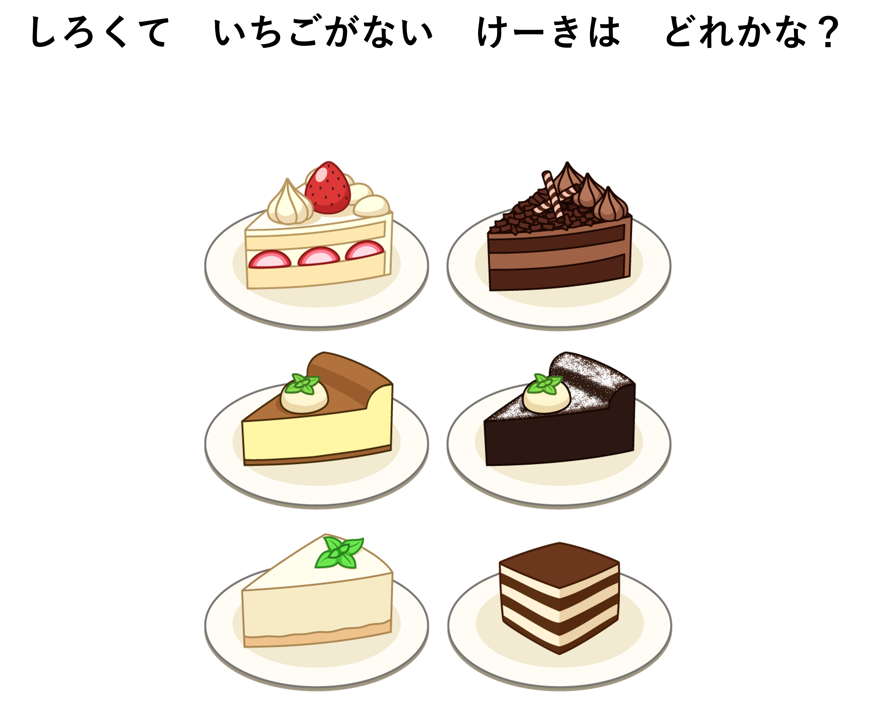 できたら次は「白くていちごがのってないケーキはどれかな?」と伝えます。子供が悩んでいるようなら、はじめに「白いのはどれかな?」と伝えてしぼらせて、そのあとに「いちごがないのはどれかな?」と絞ったものから選ばせます。