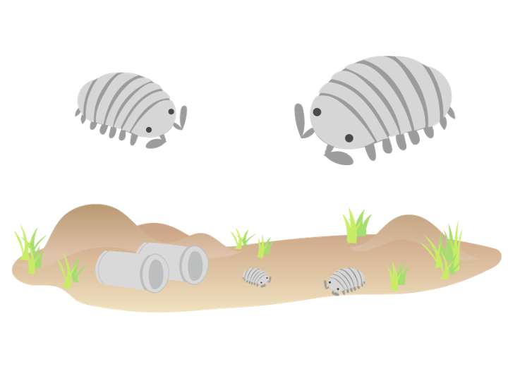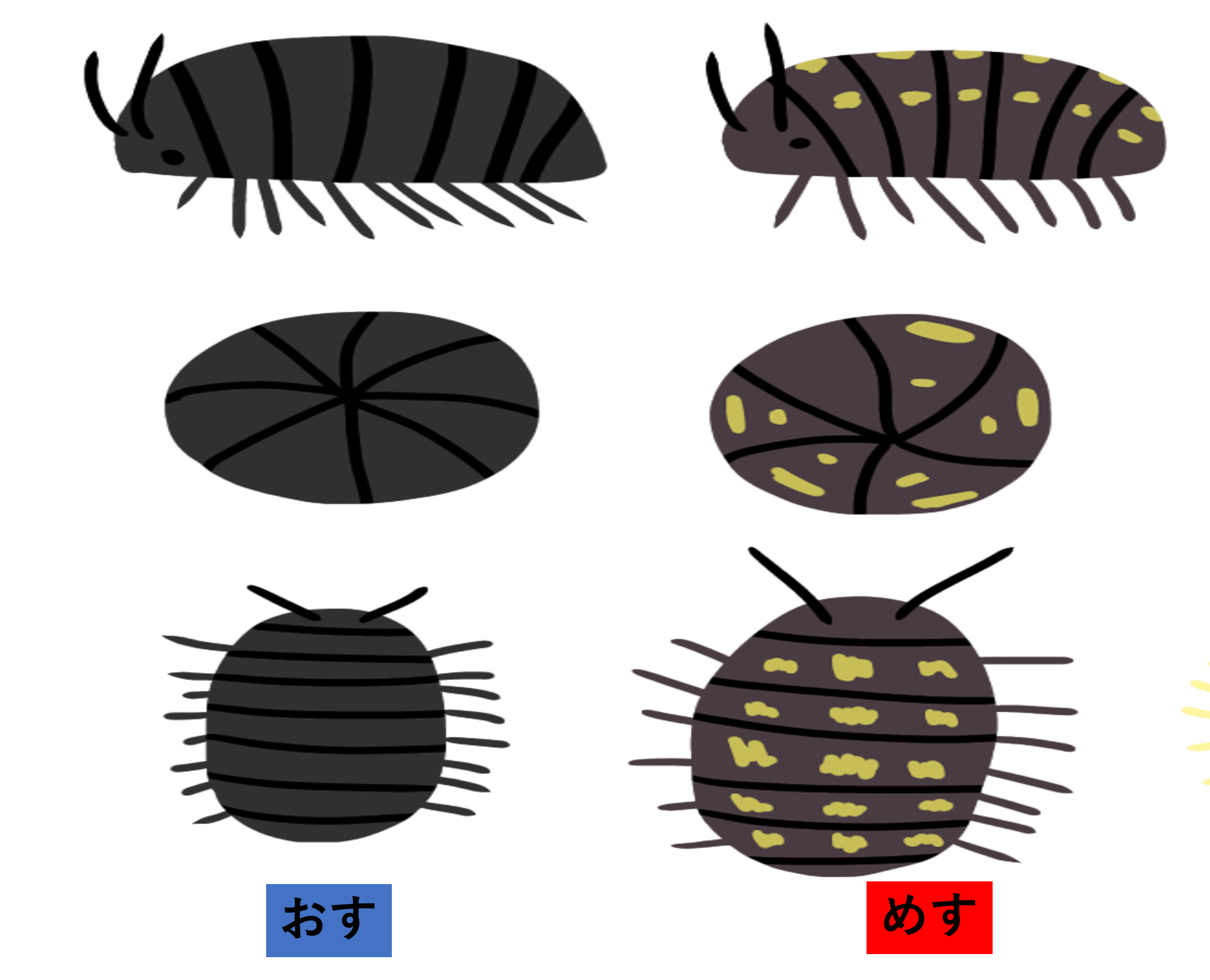 またダンゴムシは、背中に模様がついてるのがメスで、模様がついてないのがオスです。